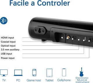 De soundbar biedt meerdere ingangen: Bluetooth, optisch (TOSLINK), AUX (3,5 mm), USB (voor U-schijven), coax en HDMI ARC. U kunt eenvoudig wisselen tussen bronnen met de afstandsbediening en audio vanaf USB-flashdrives rechtstreeks afspelen; controleer de handleiding voor de ondersteunde bestandsformaten.
