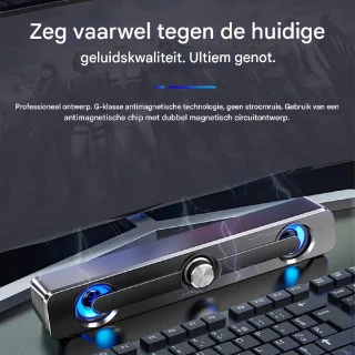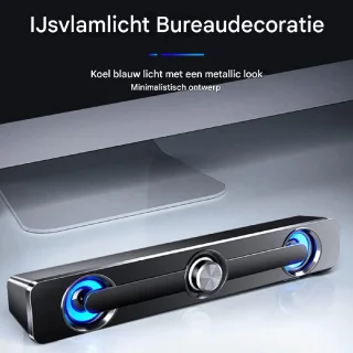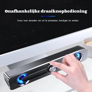 - USB-voeding: De soundbar wordt gevoed via een vrije USB-poort (laptop, adapter of powerbank). Geen opladen of externe stroomadapter nodig.