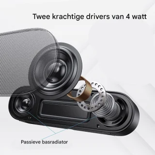 - Krachtig en gebalanceerd geluid — Twee hoogwaardige drivers zorgen voor een warme, volle klank en duidelijke middentonen. Geluid dat je media tot leven brengt zonder extra subwoofer.