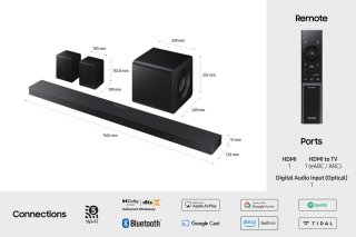 Het minimalistische, Titan Black-design past naadloos in moderne interieurs. Dankzij Convertible Fit en de automatische positionering via gyrosensor geniet je altijd van de beste Dolby Atmos-ervaring, ongeacht of de soundbar op een meubel staat of onder de tv hangt. De draadloze connectiviteit houdt je kijkruimte overzichtelijk, terwijl eenvoudige installatie via HDMI eARC, Wi‑Fi of Bluetooth snel klaar is.