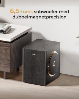 - Krachtige, draadloze bas: de meegeleverde draadloze subwoofer levert diepe, strak gecontroleerde lage tonen zonder extra kabels door de kamer.