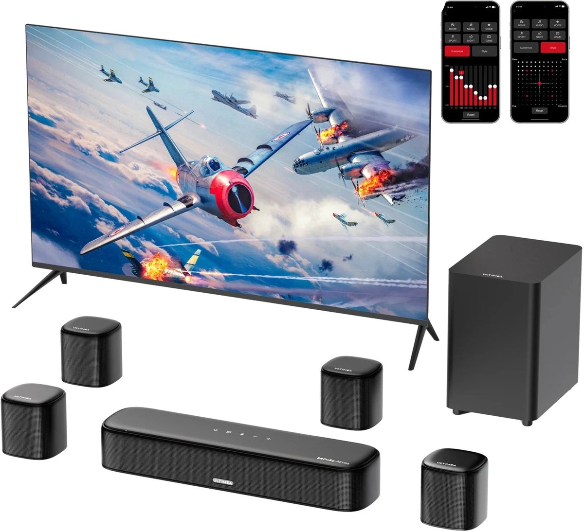 Inclusief losse subwoofer en draadloze achterspeakers voor een dynamisch en draadloos surroundgeluid zonder rommelige kabels.