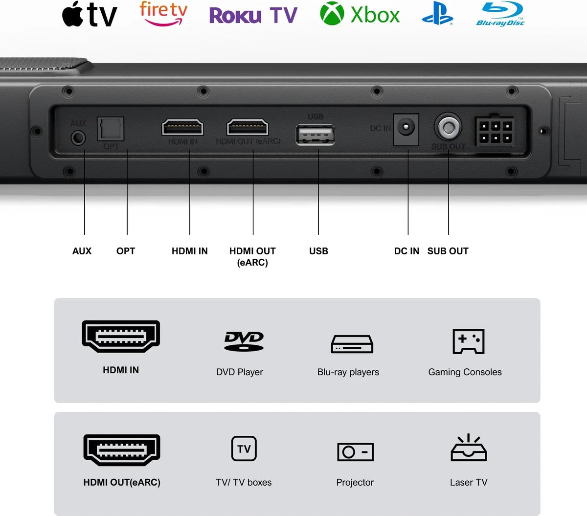 Met geïntegreerde Bluetooth-functie stream je je favoriete muziek draadloos vanaf elke smartphone of tablet. De soundbar beschikt verder over een HDMI-ingang, HDMI-uitgang en een optische uitgang, zodat je eenvoudig aansluitingen maakt met je TV en andere apparaten. Let op: hij ondersteunt geen Wi-Fi of draadloze achterluidsprekers, voor een simpele en betrouwbare verbinding.