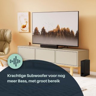 - Opstelling: 2.1 (soundbar + losse bekabelde subwoofer)