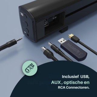 - AUX, RCA, USB, optische aansluiting en ARC ondersteunen bijna elke tv en bronapparaat.