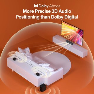 Sluit de soundbar idealiter aan met een HDMI-kabel via HDMI-eARC voor hoogwaardige, onbewerkte audio. Als je tv geen eARC heeft, kun je de optische uitgang gebruiken voor surroundgeluid, of Bluetooth voor draadloze stereo-audio, al biedt dat geen Atmos. De set heeft één HDMI-ingang en één uitgang, dus controleer je apparaten en gebruik indien nodig een HDMI-switch of zet apparaten via de tv door.