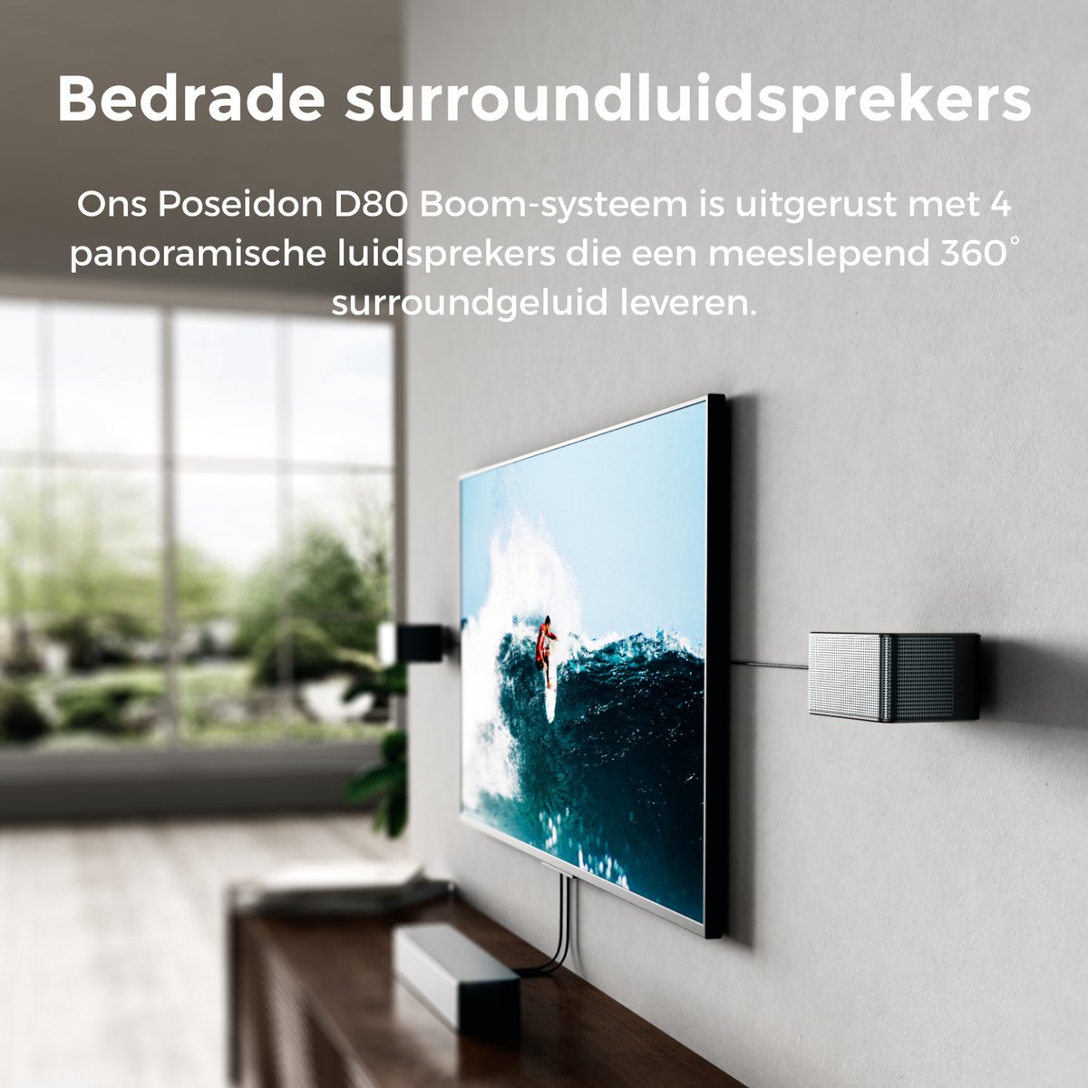 In stralend zwart en met een slank profiel past de Poseidon D80 Boom perfect in elke woonkamer of gamingruimte. Het systeem weegt slechts 7,9 kg en heeft een breedte van 40 cm, hoogte van 7 cm en diepte van 9 cm, waardoor hij zowel krachtig als stijlvol is.