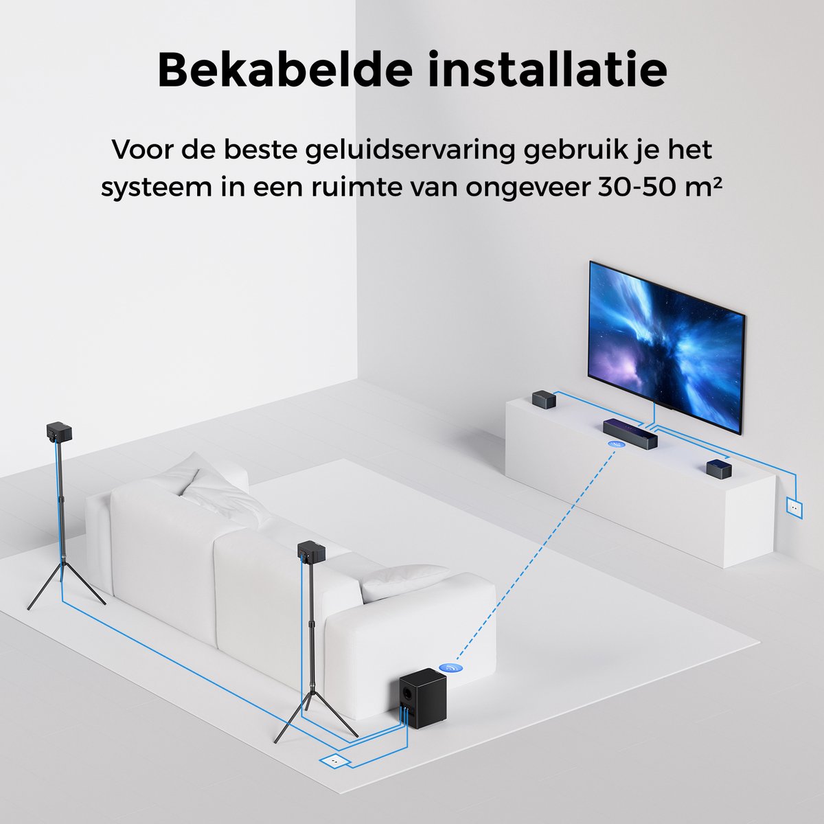 Dit systeem wordt compleet gemaakt met twee draadloze achterspeakers en twee front-surroundspeakers, waardoor een breder en dynamisch geluidsbeeld ontstaat. Gebruikmakend van SurroundX™-technologie en 360° Aural Spatial Location, worden alle details haarscherp en precies op hun plek geplaatst. Waveguides sturen het geluid door de kamer voor een natuurlijke en rijke luisterervaring.