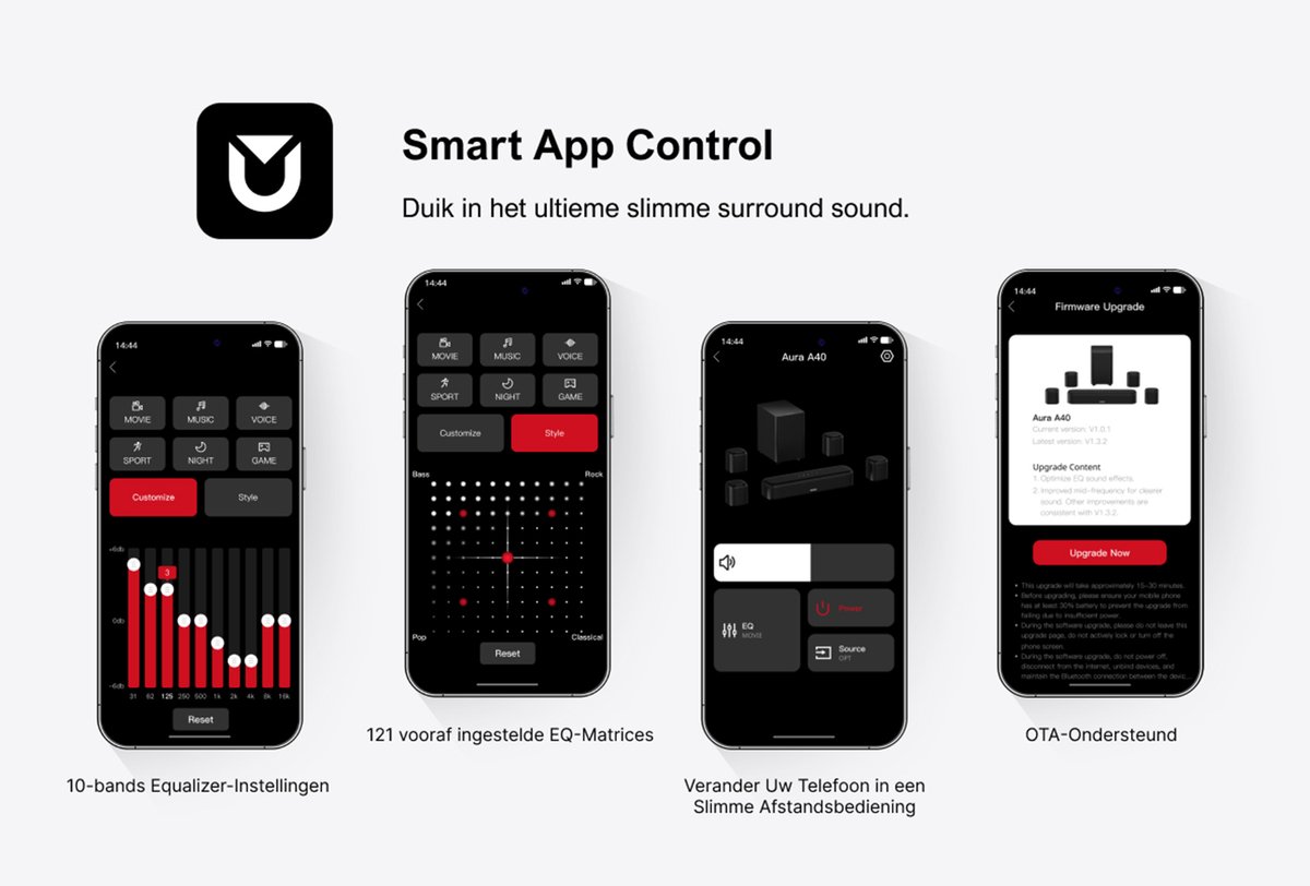 Regel de volledige EQ-parameters en pas de sound aan je voorkeur aan via de gebruiksvriendelijke Ultimea Smart App. Of je nu film, muziek, spraak, sport, gaming of nachtrust als modus kiest, alles is binnen handbereik. Regelmatig krijgen de software en functies automatische OTA-updates, zodat je altijd profiteert van de nieuwste technologische snufjes en verbeteringen.